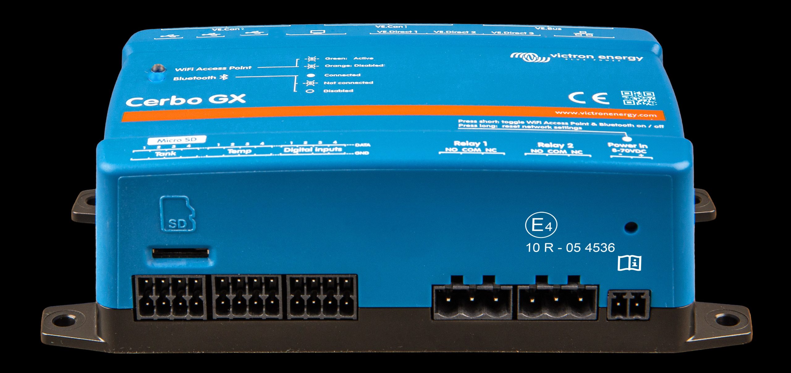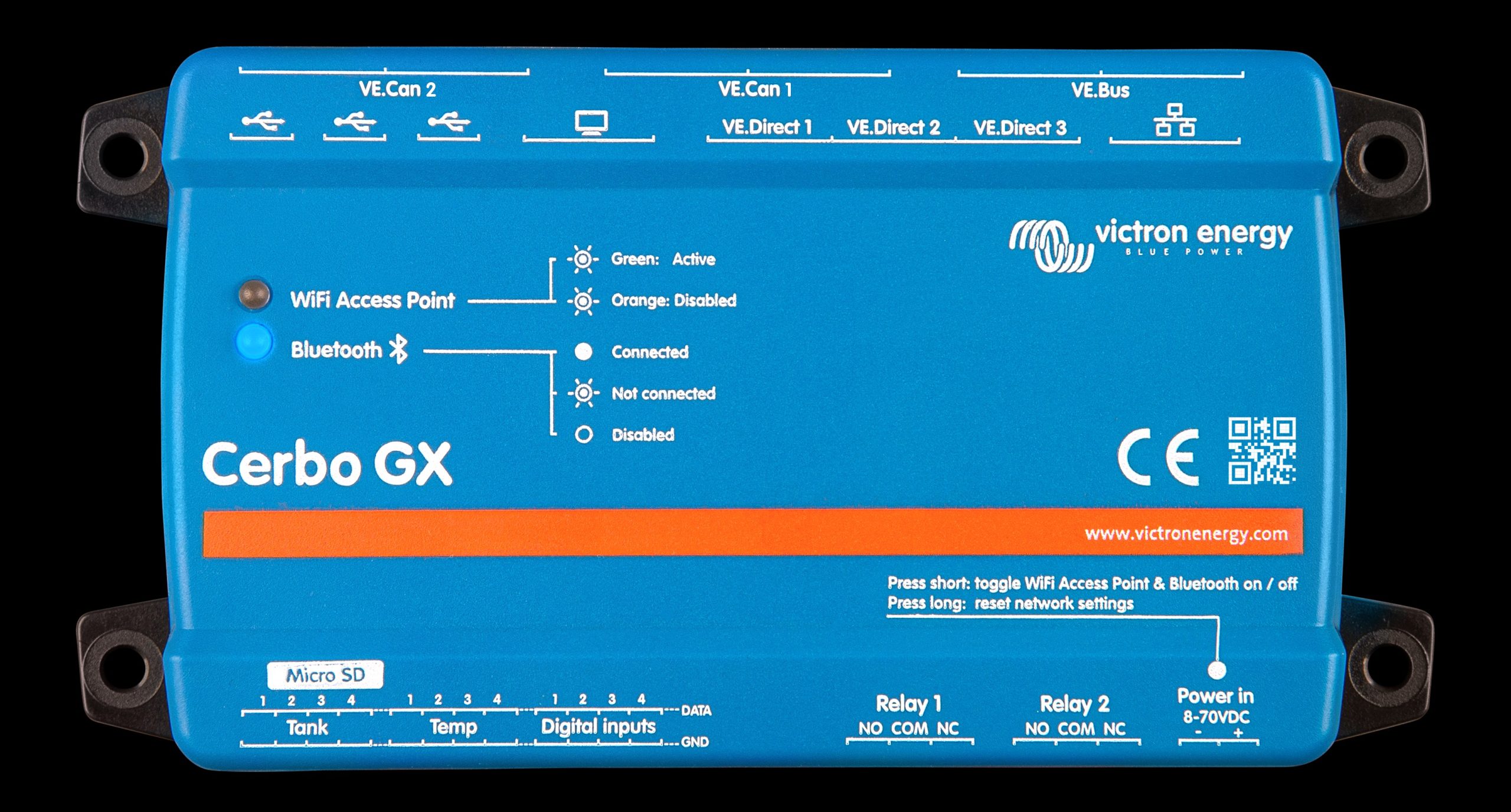Enheden understøtter en bred vifte af kommunikationsmuligheder såsom VE.Can, VE.Direct, USB, Bluetooth og WiFi, hvilket giver maksimal fleksibilitet i både private og professionelle installationer. Cerbo GX kan monteres på væg eller DIN-skinne og er designet til stabil drift i krævende miljøer som både, autocampere, off-grid huse og industrielle energisystemer.
